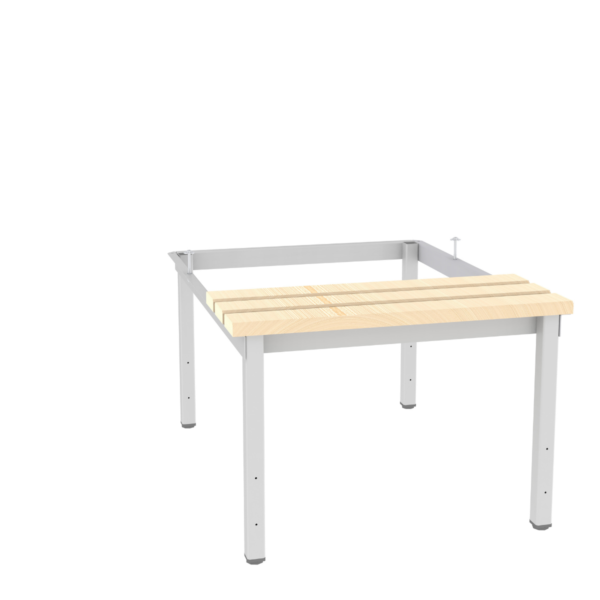 Zastosowana podstawa P 323 W ze stałym siedziskiem wykonanym z listew drewnianych lakierowanych bezbarwnie pozwala na wygodne przebranie się i zachowanie higieny w szatni.