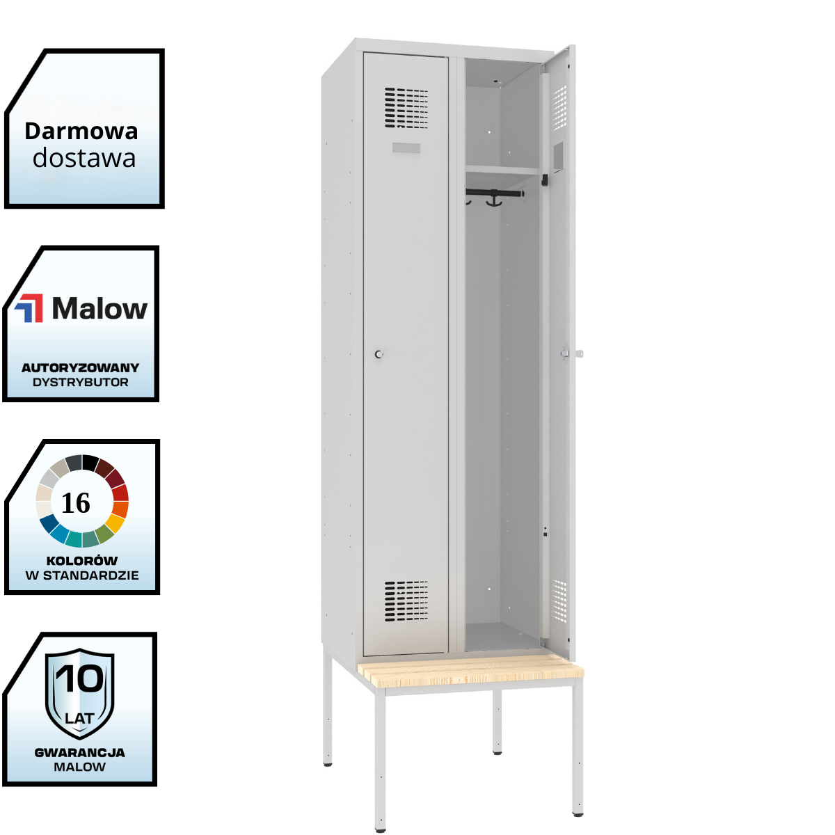 Szafa metalowa ubraniowa BHP na podstawie ze stałym siedziskiem SUM 320 W + P 323 W Malow – dwudrzwiowa wysoka szafa z ławeczką 219 cm