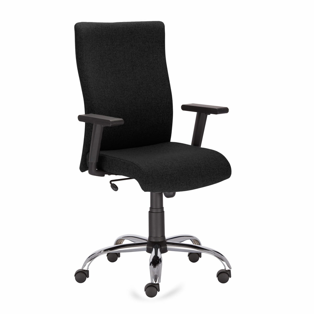 Podłokietniki R19T (1D) wykonane z czarnego poliamidu z nakładką z polipropylenu oferują podstawową regulację i wygodne podparcie rąk. Chromowana, pięcioramienna podstawa (ST02-CR) oraz samohamowne kółka do miękkich powierzchni gwarantują stabilność i płynną mobilność.