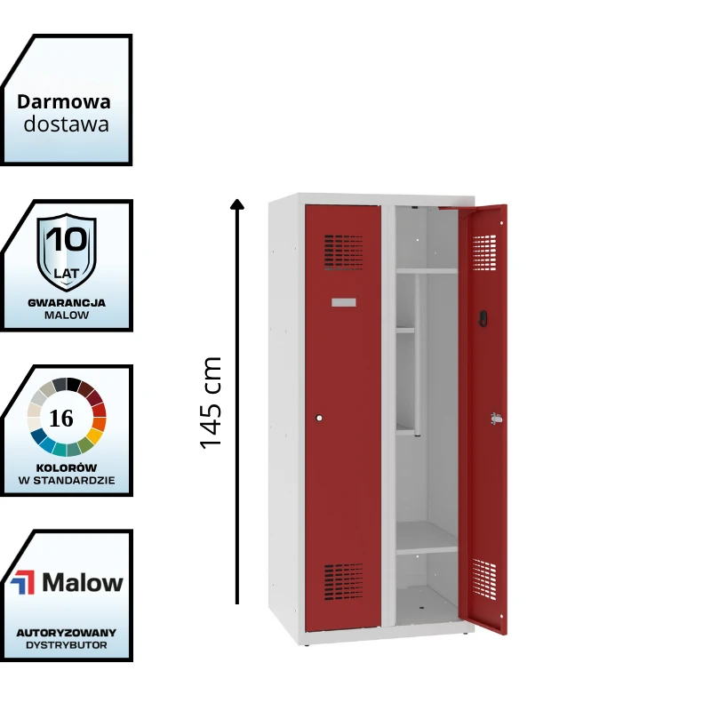 Metalowa szafka szkolna MSUM 320S to praktyczna, dwudrzwiowa szafa ubraniowa o wysokości 1450 mm, zaprojektowana do szkół i przedszkoli. Dzięki podziałowi na dwie komory umożliwia wygodne użytkowanie przez dwóch uczniów przy zachowaniu kompaktowych wymiarów.