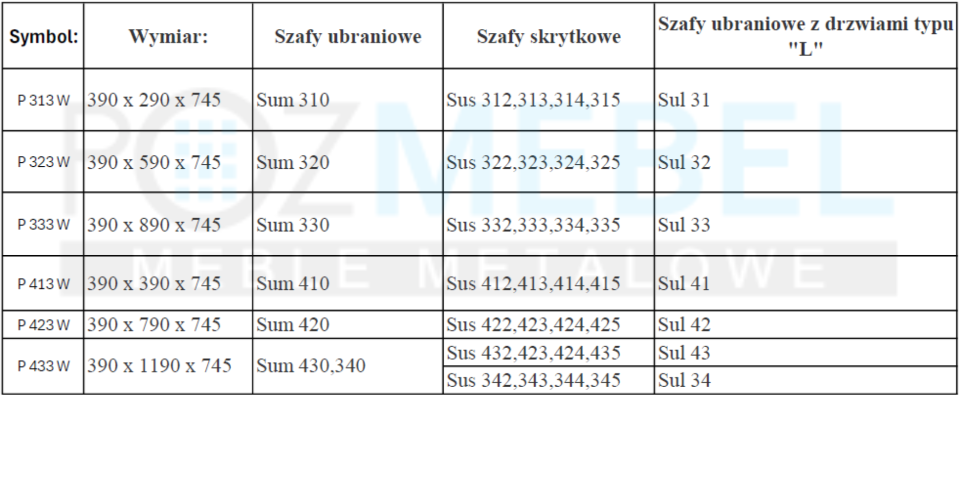 Poniższa tabela przedstawia kompatybilność podstaw z szafami metalowymi.