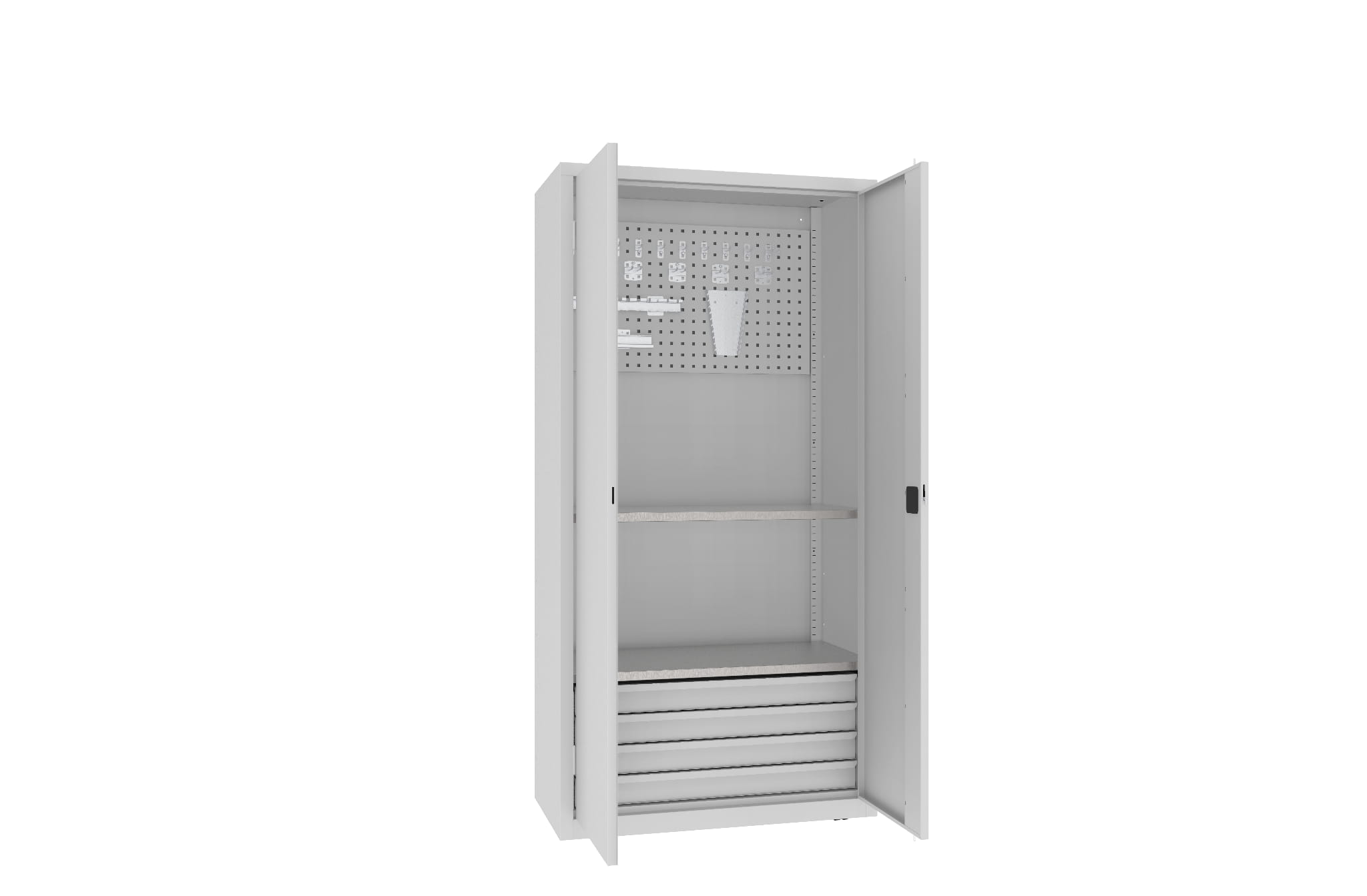- Wyposażenie 2 półki ocynkowane + blok 4 szuflad + ścianka narzędziowa + Uchwyt na 14 pilników lub wierteł + Uchwyt na 10 kluczy płaskich + Uchwyt na 12 śrubokrętów + 10 haczyków pojedynczych + 5 haczyków podwójnych