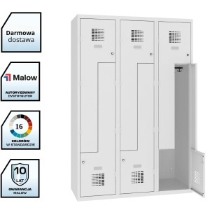 Szafa ubraniowa SUL 43 marki MALOW to solidna, funkcjonalna i ergonomiczna szafa metalowa o wymiarach 1200 × 500 × 1800 mm, wyposażona w 3 komory z drzwiami w kształcie litery „L” – łącznie 6 skrytek. Taki układ pozwala zaoszczędzić miejsce w pomieszczeniach socjalnych, jednocześnie zapewniając każdemu użytkownikowi wygodny dostęp do osobistej przestrzeni na ubrania i rzeczy osobiste.