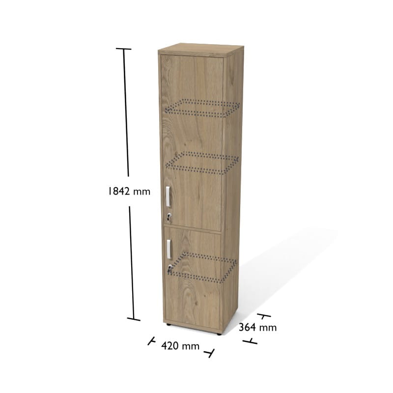 Wąska szerokość 420 mm, głębokość 364 mm i wysokość 1842 mm zapewniają funkcjonalność przy jednoczesnej oszczędności miejsca.