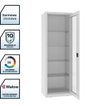 Przeszklone drzwi umożliwiają bieżącą kontrolę zawartości bez konieczności otwierania szafy, co sprzyja utrzymaniu porządku i organizacji pracy.
