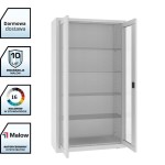 Przeszklone drzwi umożliwiają bieżącą kontrolę zawartości bez konieczności otwierania szafy, co poprawia ergonomię pracy personelu.