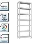 Regał metalowy montowany na wcisk RMM 320 posiada 7 wzmocnionych metalowych półek, regulowanych co 30 mm.
