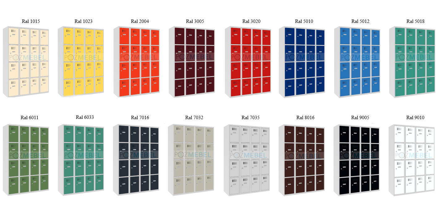 Wymiary całkowite szafy to 120 cm szerokości, 50 cm głębokości oraz 180 cm wysokości. Każda z 16 skrytek wyposażona jest w osobny zamek cylindryczny w systemie master, który zapewnia komfort i bezpieczeństwo użytkowania. Możliwość stosowania także zamków depozytowych, elektronicznych lub uchwytu na kłódkę zwiększa funkcjonalność szafy.
