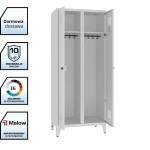 Dzięki szerokości 800 mm szafa oferuje większą przestrzeń użytkową, a nogi trwale zgrzewane do korpusu oraz całkowita wysokość 1940 mm czynią ją odpowiednim rozwiązaniem do nowoczesnych szatni pracowniczych i zapleczy BHP.