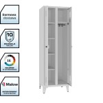 Szafa pracownicza metalowa WZD 61 na nogach została zaprojektowana jako rozwiązanie dla szatni, w których kluczowe znaczenie ma funkcjonalna organizacja rzeczy osobistych, a nie wyłącznie przechowywanie odzieży wiszącej. Model ten łączy przedział ubraniowy z oddzielnym przedziałem wyposażonym w cztery półki, co czyni go praktycznym wyborem do zapleczy socjalnych i BHP.