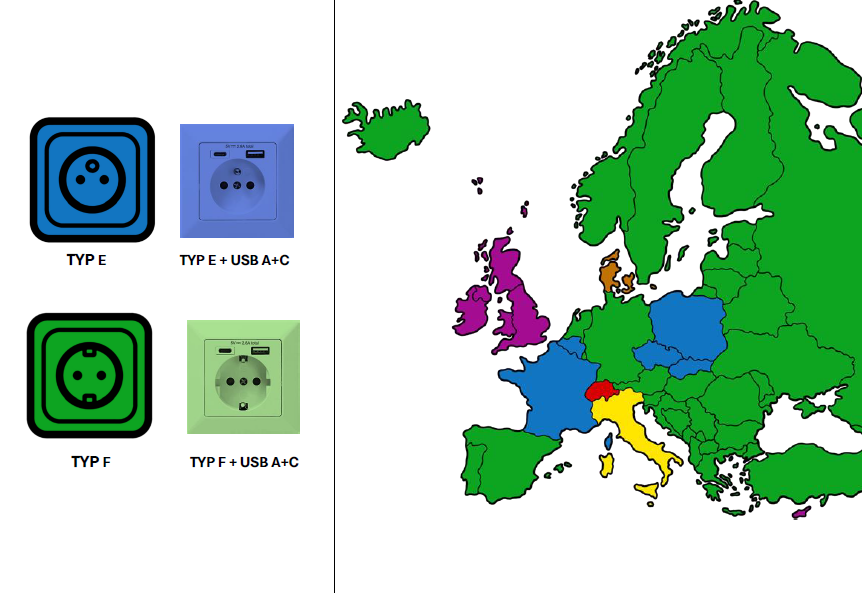wybór rodzaju gniazda elektrycznego (typ E, F, inne standardy),
