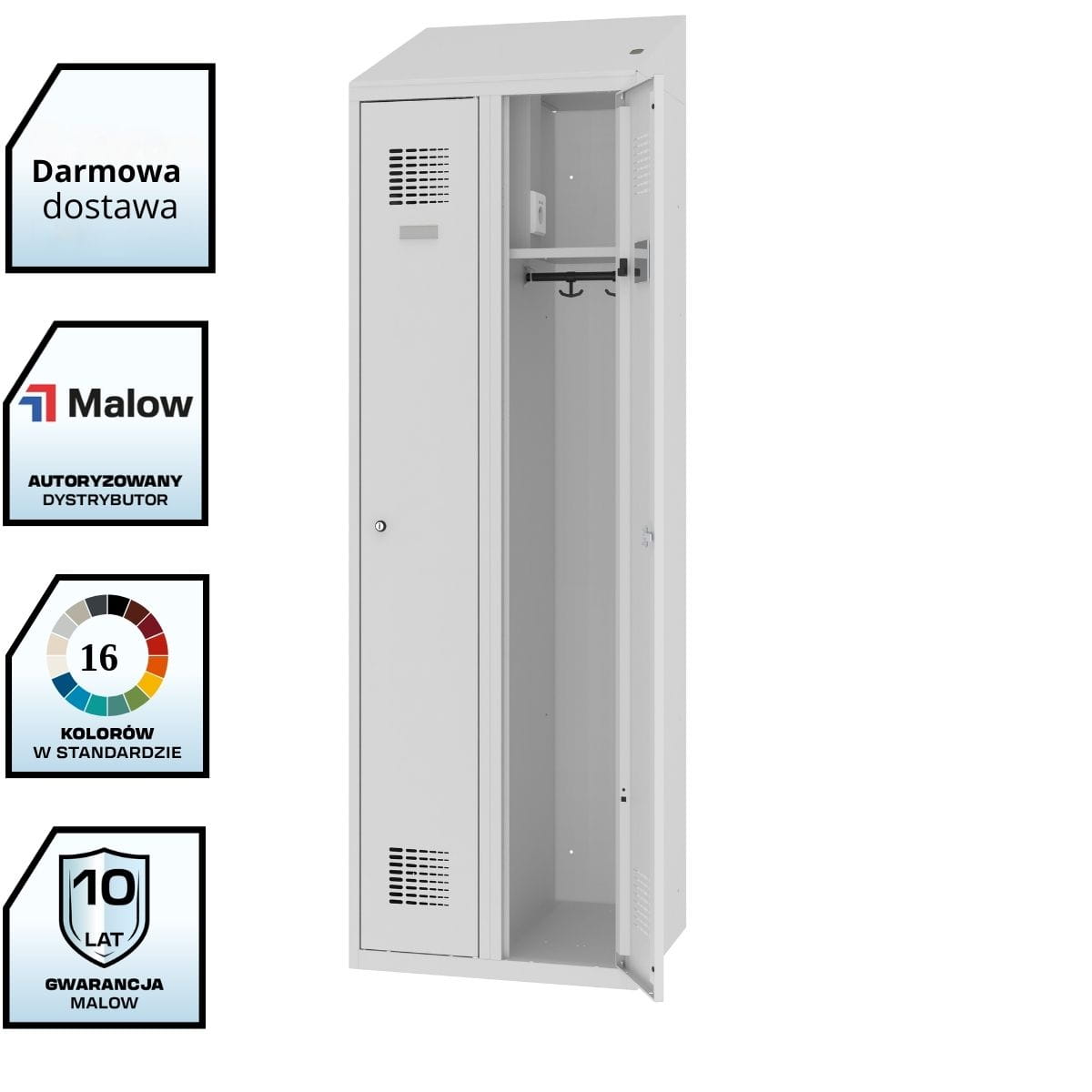 Produkt sprawdzi się jako szafa socjalna BHP, szafa ubraniowa z gniazdkiem, szafa pracownicza z USB.