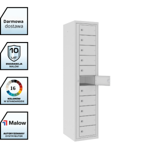 Wąska szafa gospodarcza BHP to kompaktowe rozwiązanie do organizacji pobierania czystej odzieży roboczej oraz dystrybucji artykułów ochronnych. Dzięki 11 zamykanym skrytkom sprawdzi się w miejscach o ograniczonej przestrzeni, zapewniając jednocześnie porządek i kontrolę nad wyposażeniem.